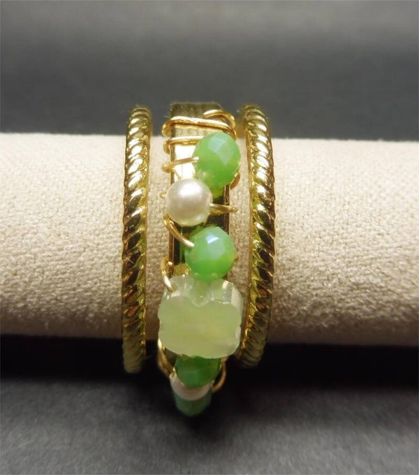 Nieuw in ons assortiment deze prachtige ring met groen, creme en wit tinten. De nieuwste trend dit jaar is sieraden met veel glaskralen, gewone kralen en glinstertjes alles is mogelijk in leuke kleurtjes en figuurtjes.