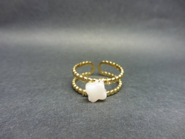 Nieuw in ons assortiment deze prachtige ring met wit tinten. De nieuwste trend dit jaar is sieraden met veel glaskralen, gewone kralen en glinstertjes alles is mogelijk in leuke kleurtjes en figuurtjes.